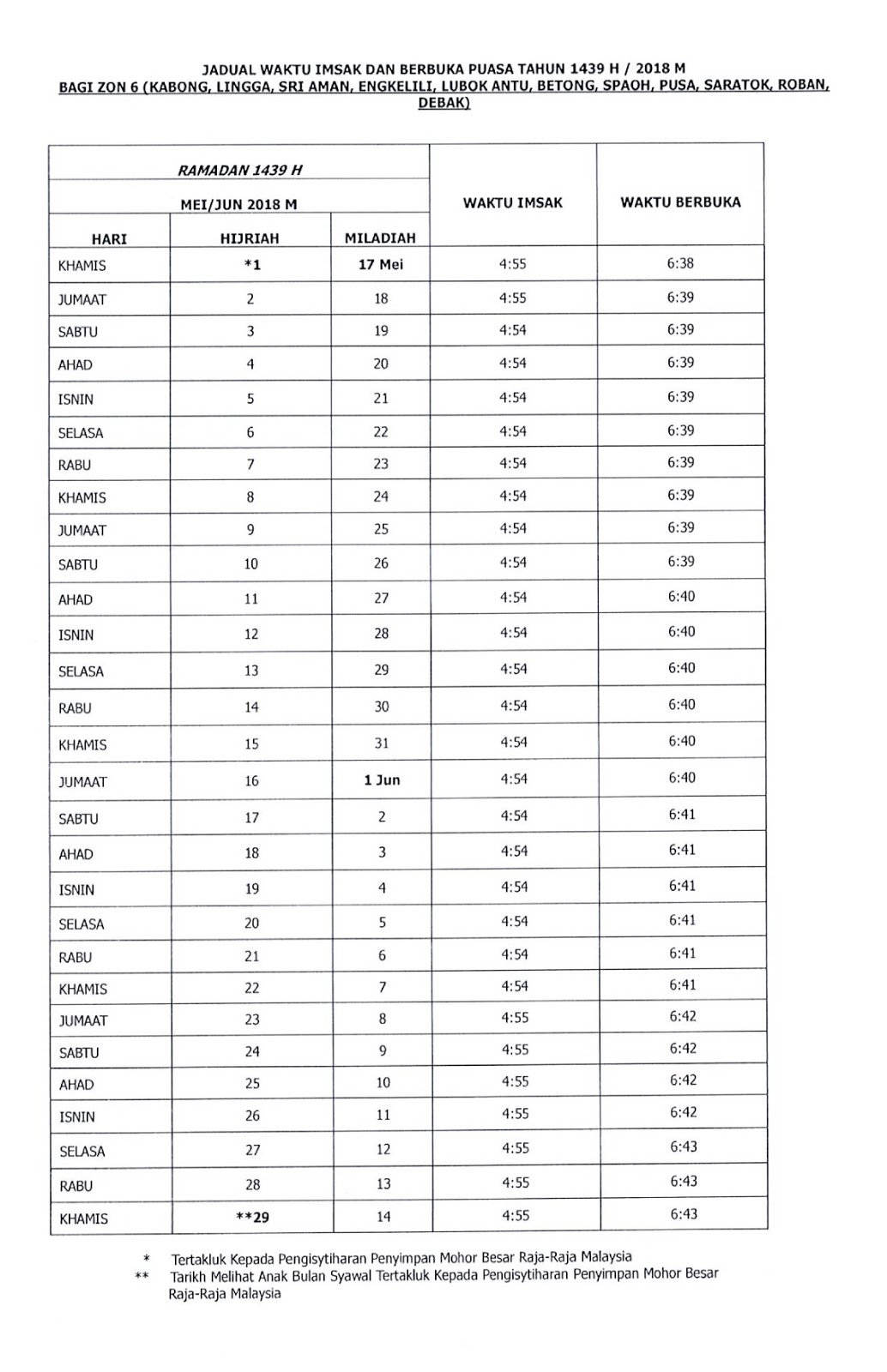 Kalendar Waktu Imsak Dan Berbuka Puasa 1439 2018 Seluruh Malaysia