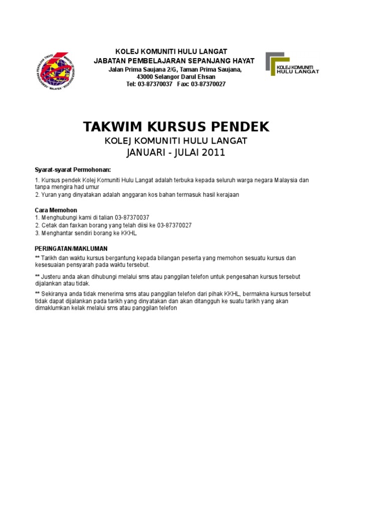 Takwim Kursus Pendek Kolej Komuniti Kolej Komuniti Hulu Langat Facebook