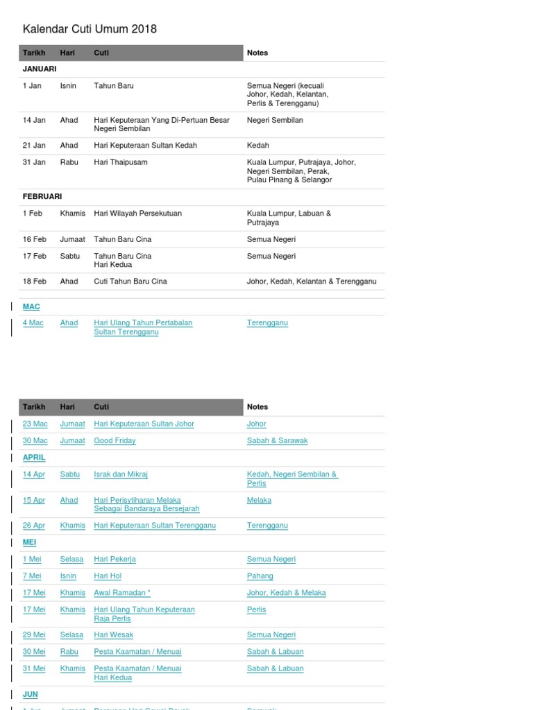 Kalendar Cuti Umum Cuti Negeri Cuti Persekolahan Malaysia 2018