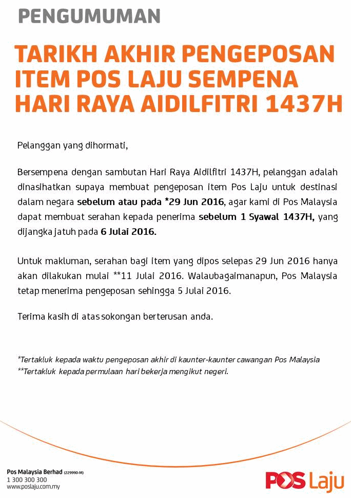 Tarikh Akhir Pengeposan Pos Laju Sebelum Hari Raya Aidilfitri 2017 Mejatulis